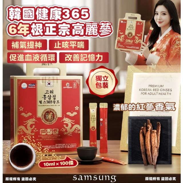 韓國製 samsung 健康365 6年根正宗高麗蔘10ml×100條