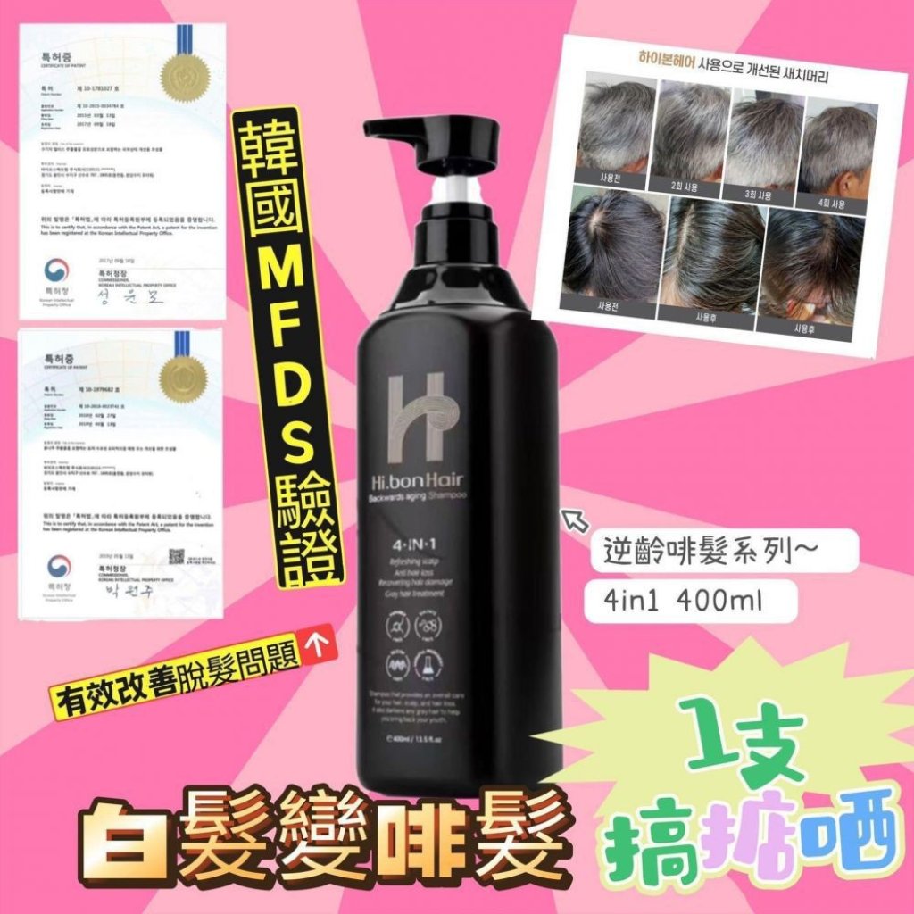 高質而低調韓國 Hi.bonHair 4-IN-1 逆齡啡髮系列︰加入高效護膚配方和成分,強大賣點可改善髮質和減少掉髮達問題之餘,更可將髮色變回輕柔啡色,重回年輕起點,Hi.bonHair產品中成份已獲取韓國食品局MFDS 驗證有效改善脫髮症狀,提升光澤感✨還可改善頭髮脆弱易斷、纖幼及暗啞等初老問題,同時增加每一條髮絲的直徑,以及改善因睡眠質素及飲食習慣所形成的灰或白髮問題,而且增加髮絲的效果**,增強髮質柔軟度,能即時增厚秀髮,細心呵護您每一吋頭皮頭髮,唔需要再染髮,都可以再次令髮質逆齡健康!