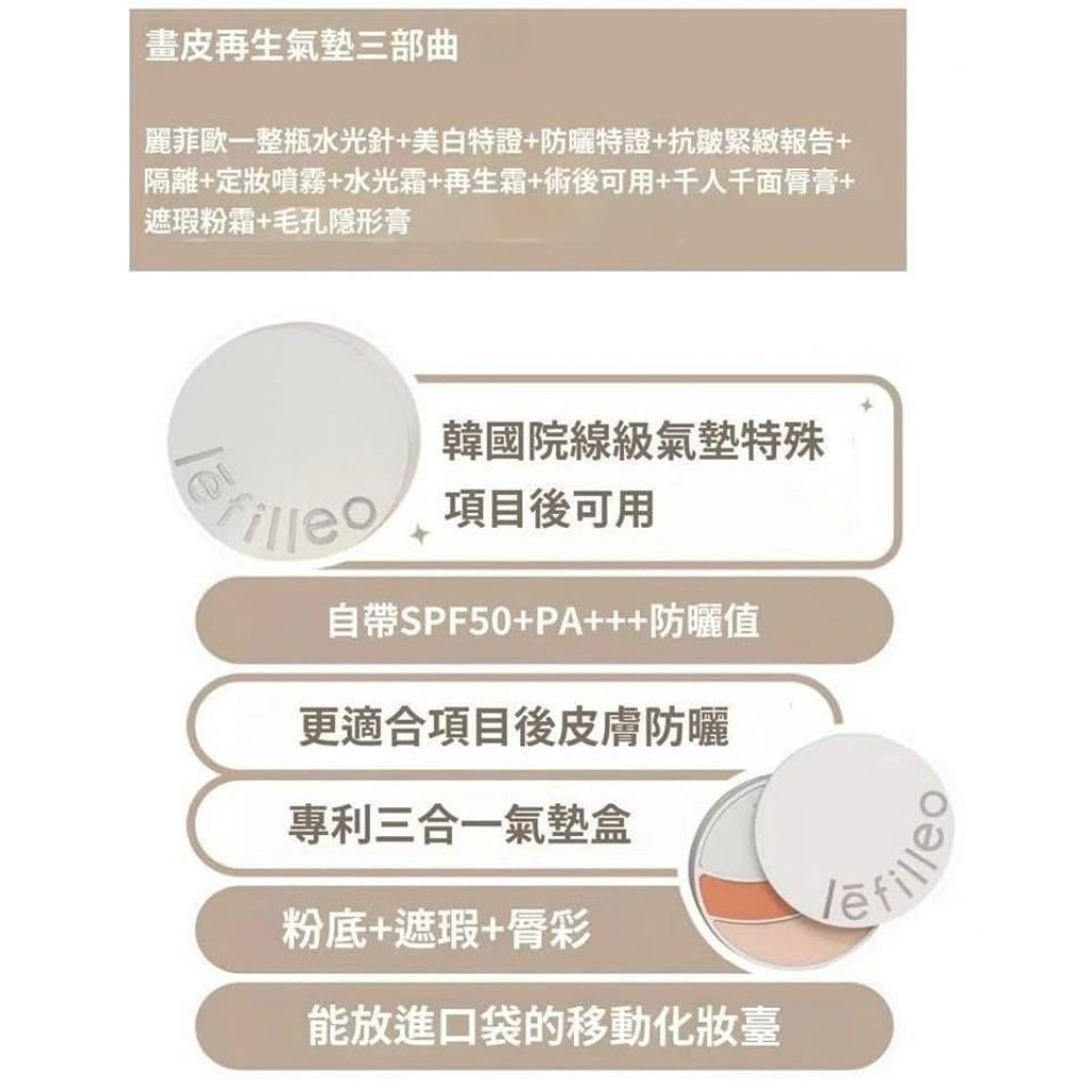 一個氣墊=麗菲歐一整瓶水光針+美白特證+防曬特證+抗皺緊致報告+隔離+定妝噴霧+水光霜+再生霜+術後可用+千人千面唇膏+遮瑕粉霜+毛孔隱形膏