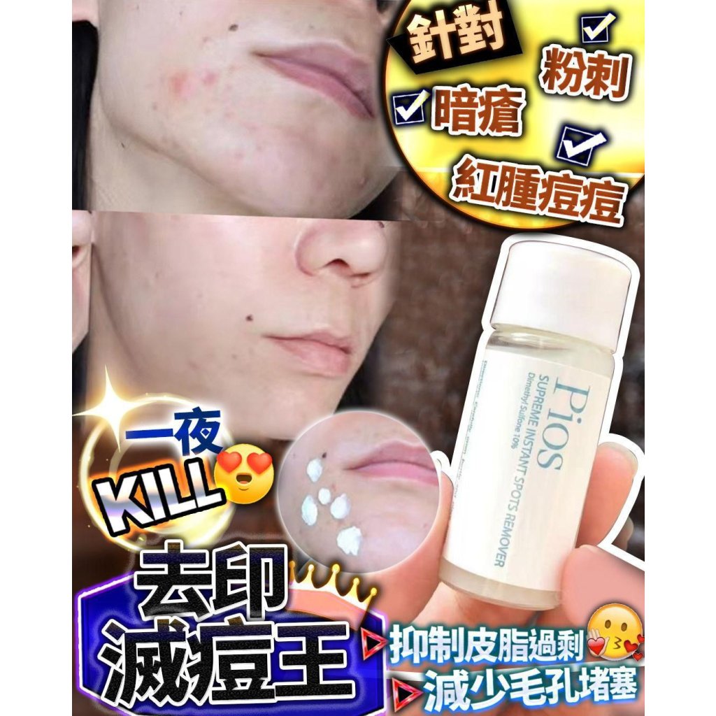 Pios瞬時去痘淨膚精華擁有「去印滅痘王」之稱,主要針對粉刺暗瘡、紅腫痘痘,有效穩定肌膚,同時讓肌膚提供屏障,抑制皮脂過剩,預防粉刺及暗瘡生長,減少毛孔堵塞,使油脂分泌更順暢,快速見效,持續使用更有助收細毛孔。